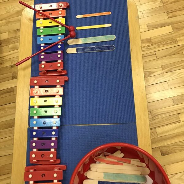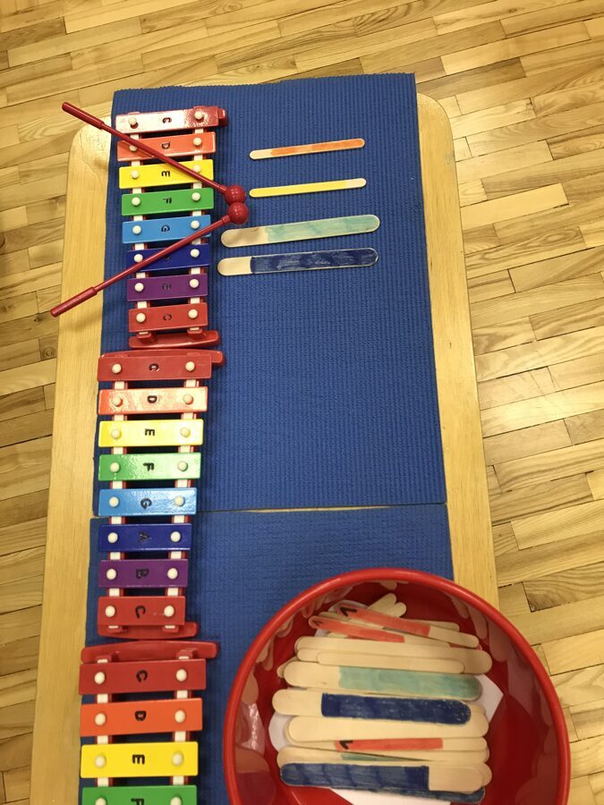 Varavīksnes krāsu metalafons. Klausies un maigi spēlē līdz. Izmanto krāsu kociņus un krāsu nošu piemērus. Saceri un uzraksti savu krāsu dziesmu.