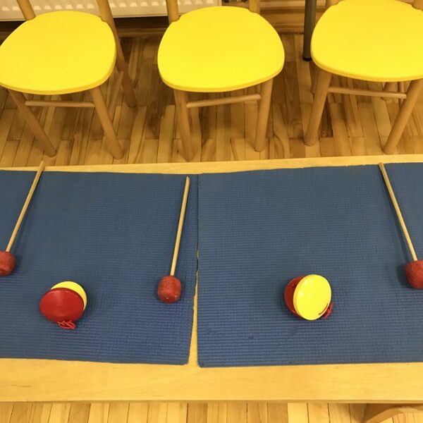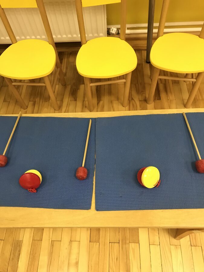 Instrumenti: koka kastītes un koka tupeles, maisāmbungas, marakasi, trijstūri, bungas (izmantoju krāsainus spaiņus) šķīvīši.